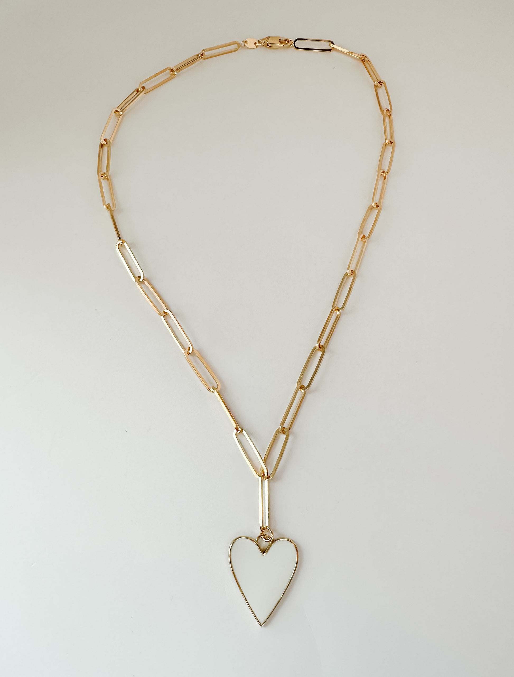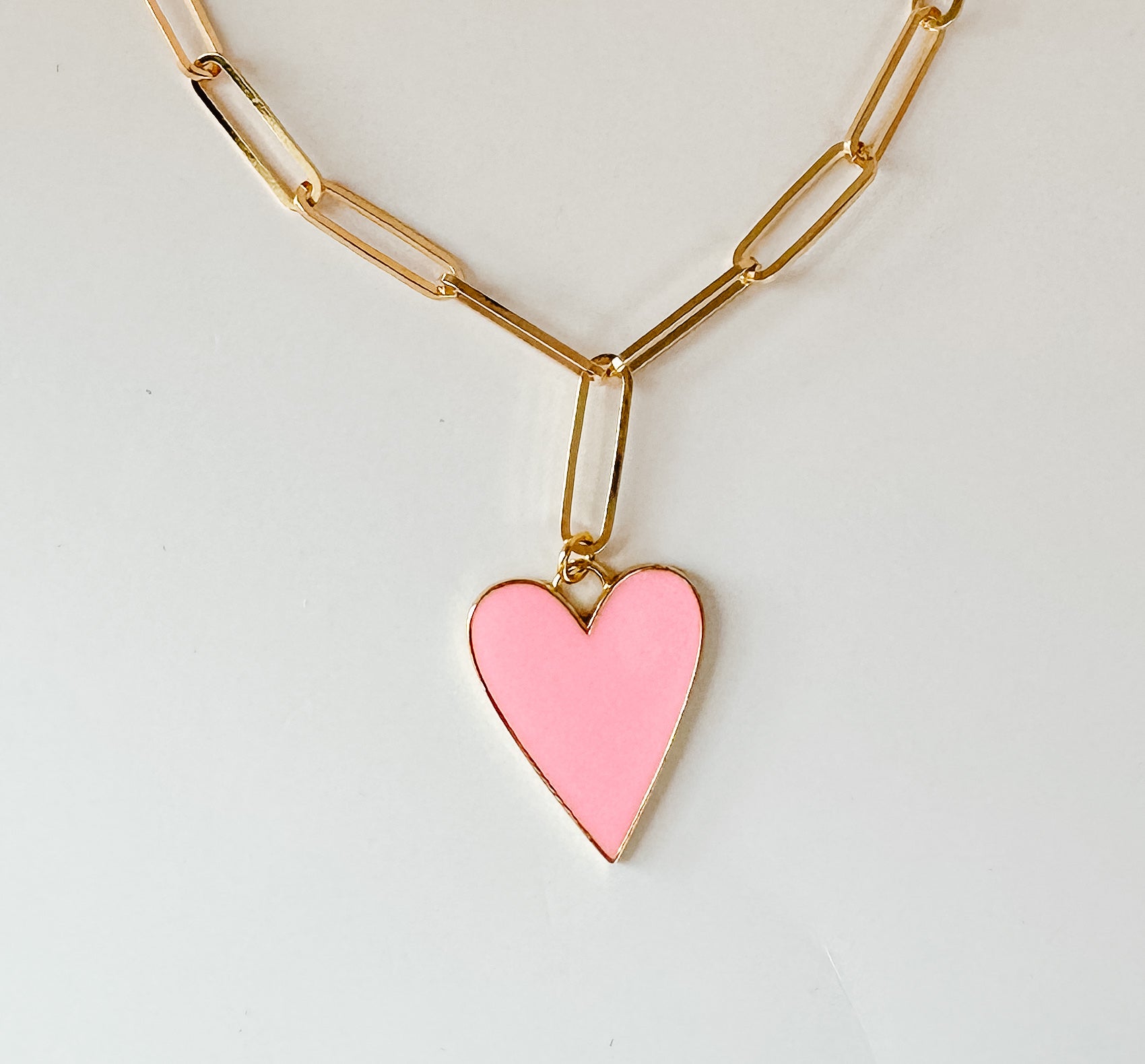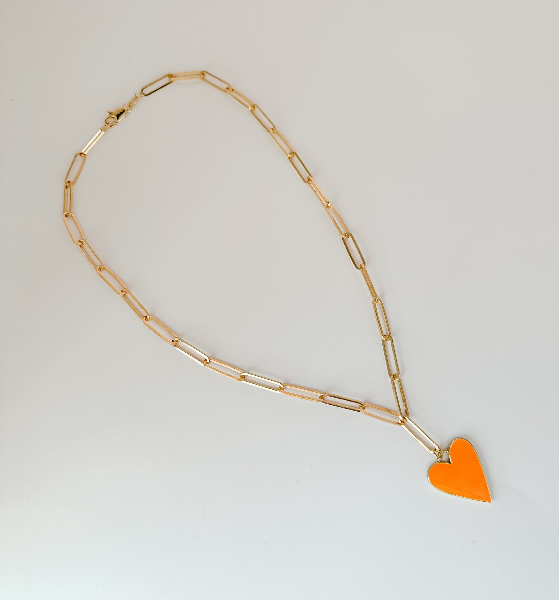 Featuring a luxe gold-filled paper clip chain and your choice of enamel heart charm, this piece says “I see you, I love you” without saying a word.