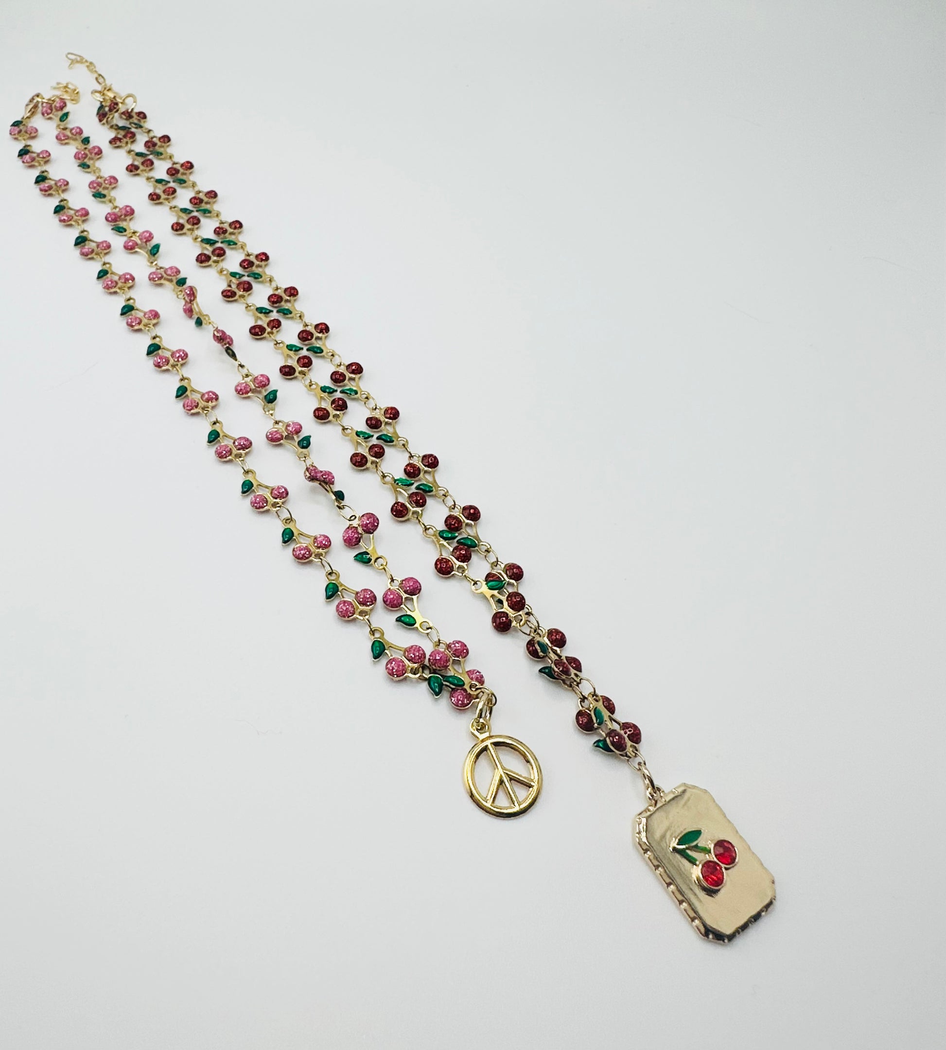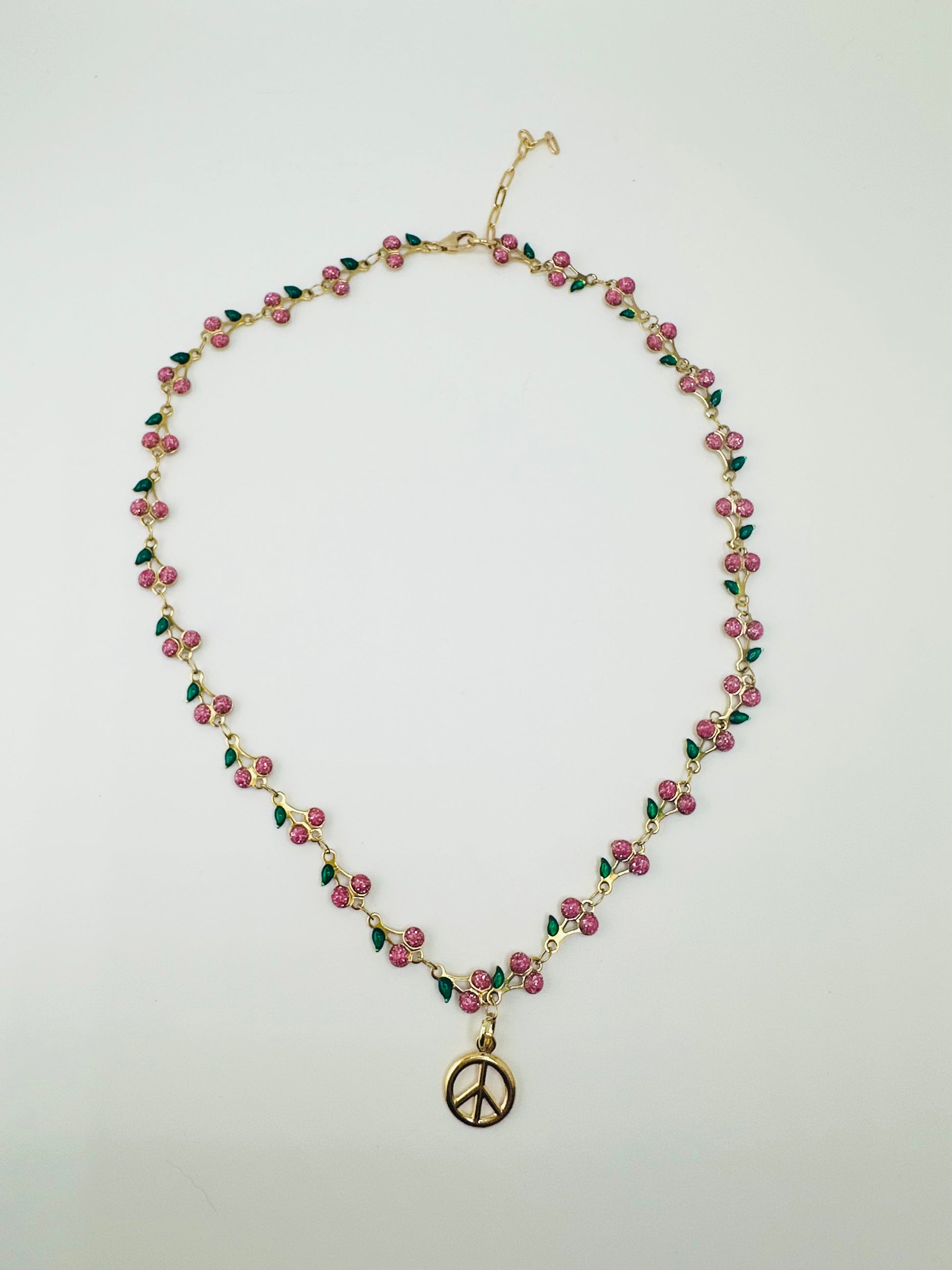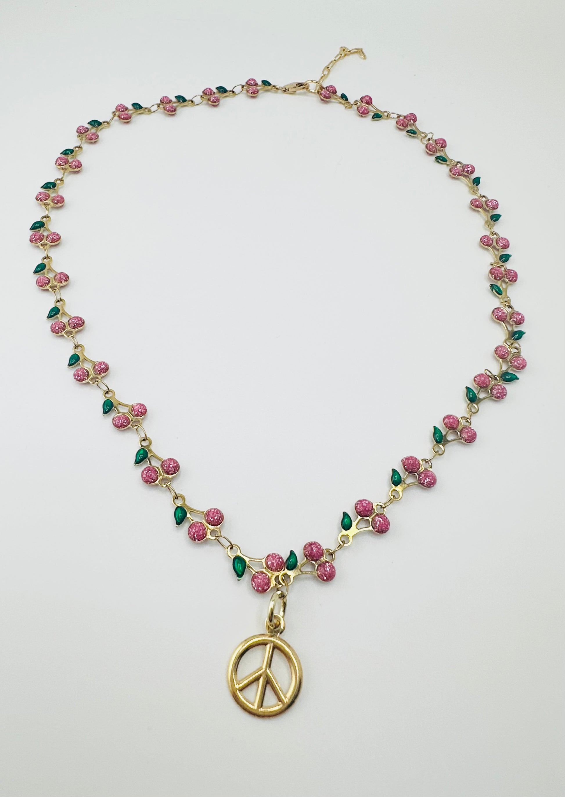This gorgeous necklace features a cherry-themed enamel chain paired with two playful charms: a glossy gold peace sign and a vintage-inspired cherry pendant. The mix of pink, red, and green enamel gives it the prettiest pop of colour — perfect for layering or wearing as a standout piece.
