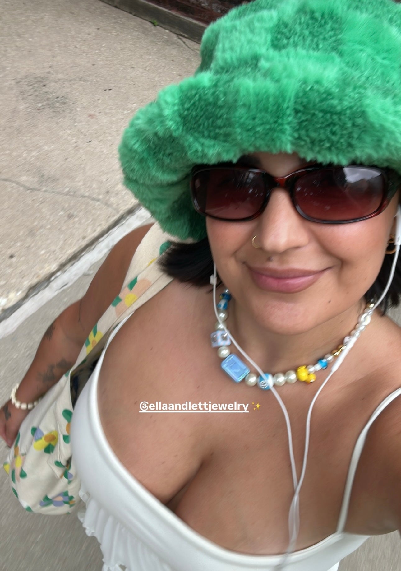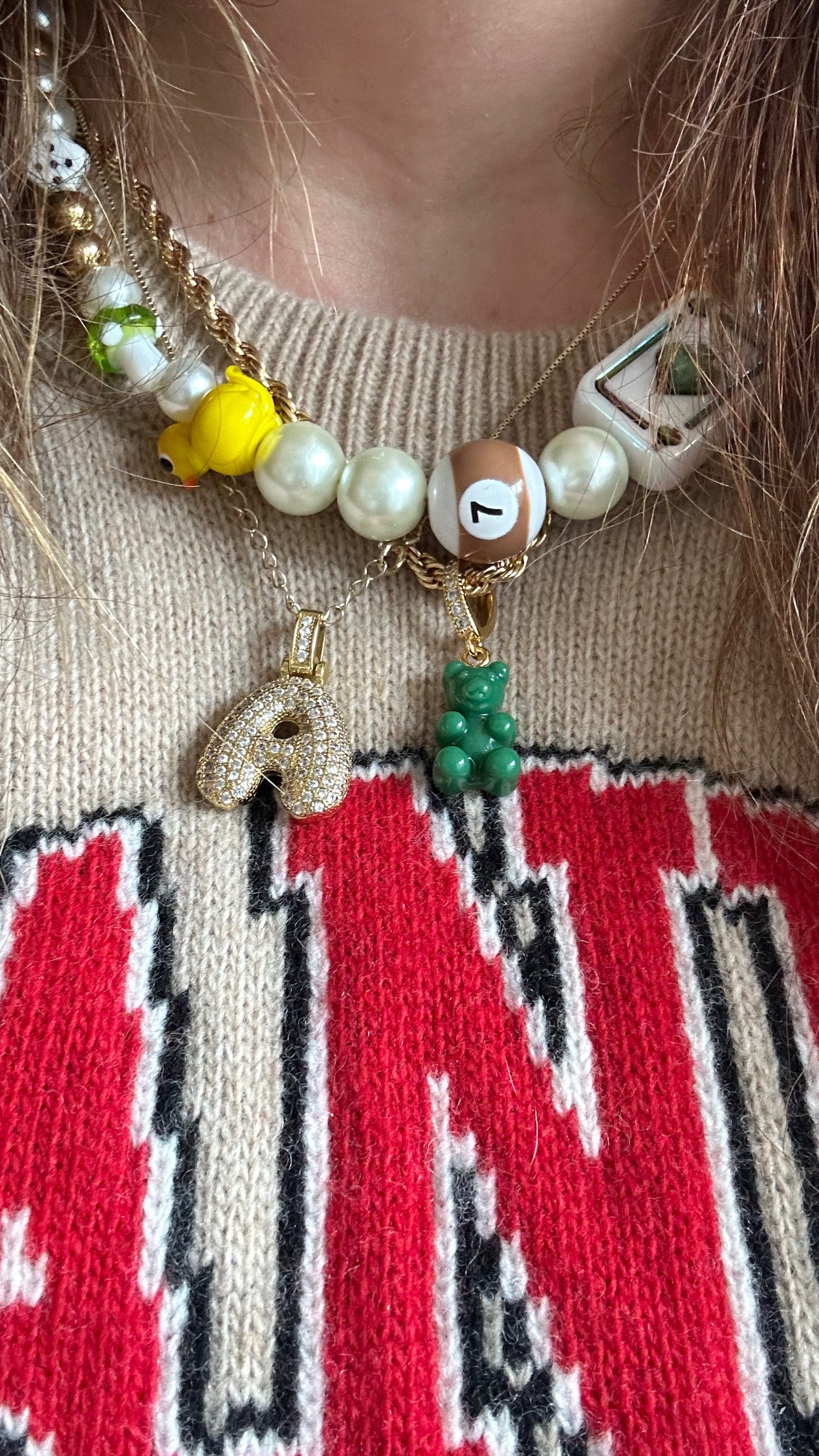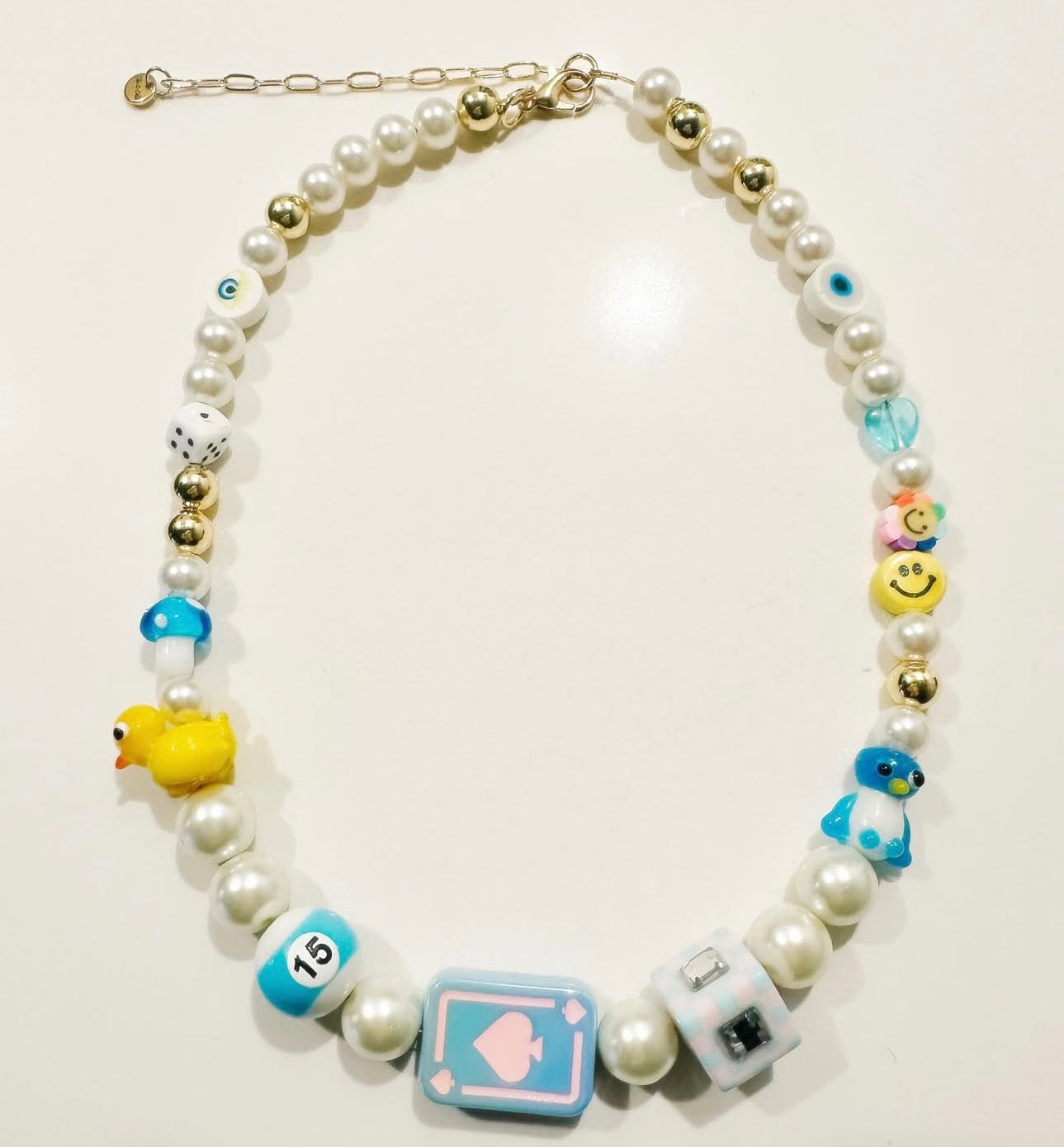 This handmade necklace brings together bold, quirky elements for a truly unique piece. Featuring chunky pearls, a 7-ball charm, mushrooms, and a cheerful yellow duck, it’s perfect for anyone who loves to mix elegance with playfulness