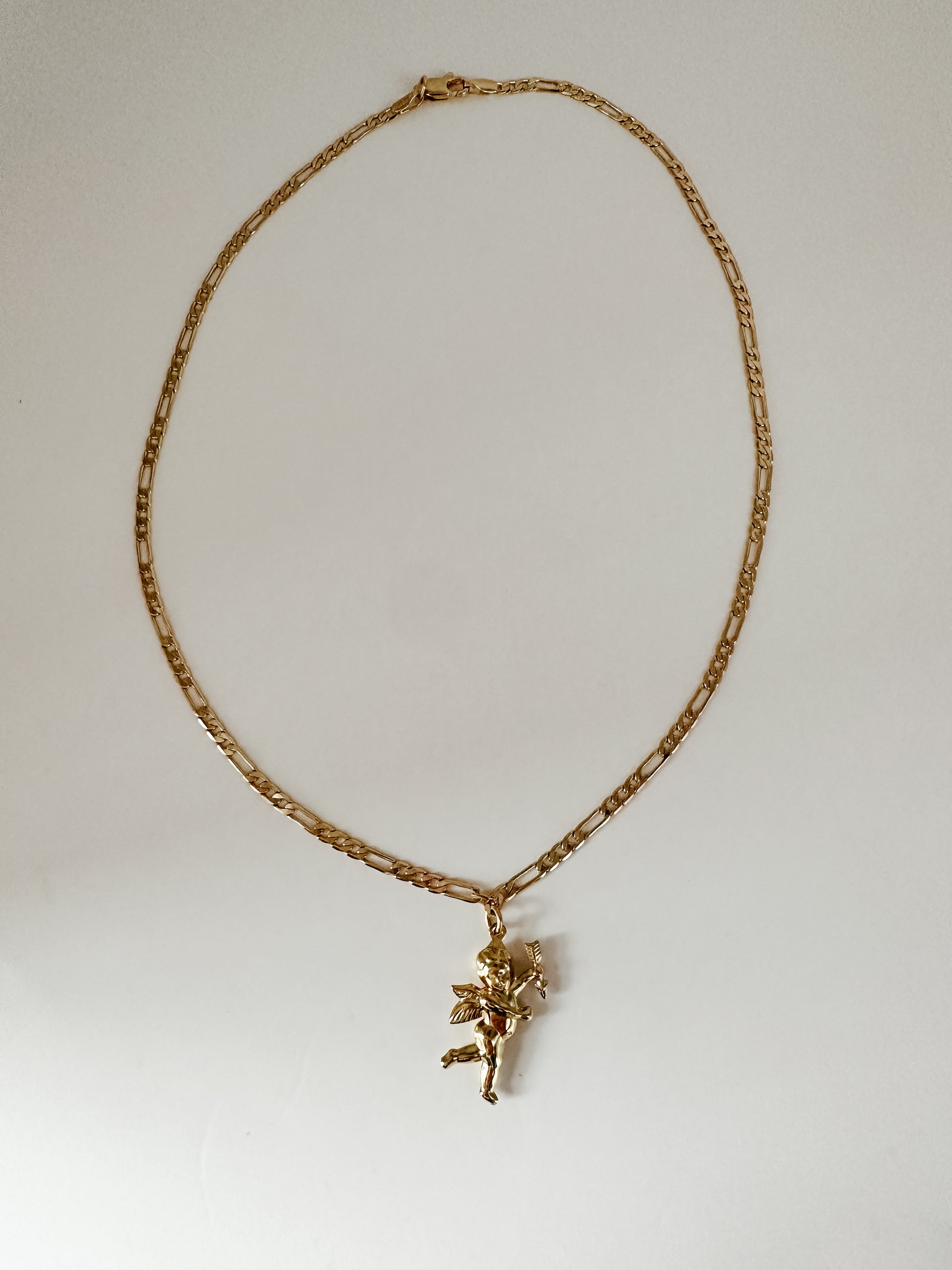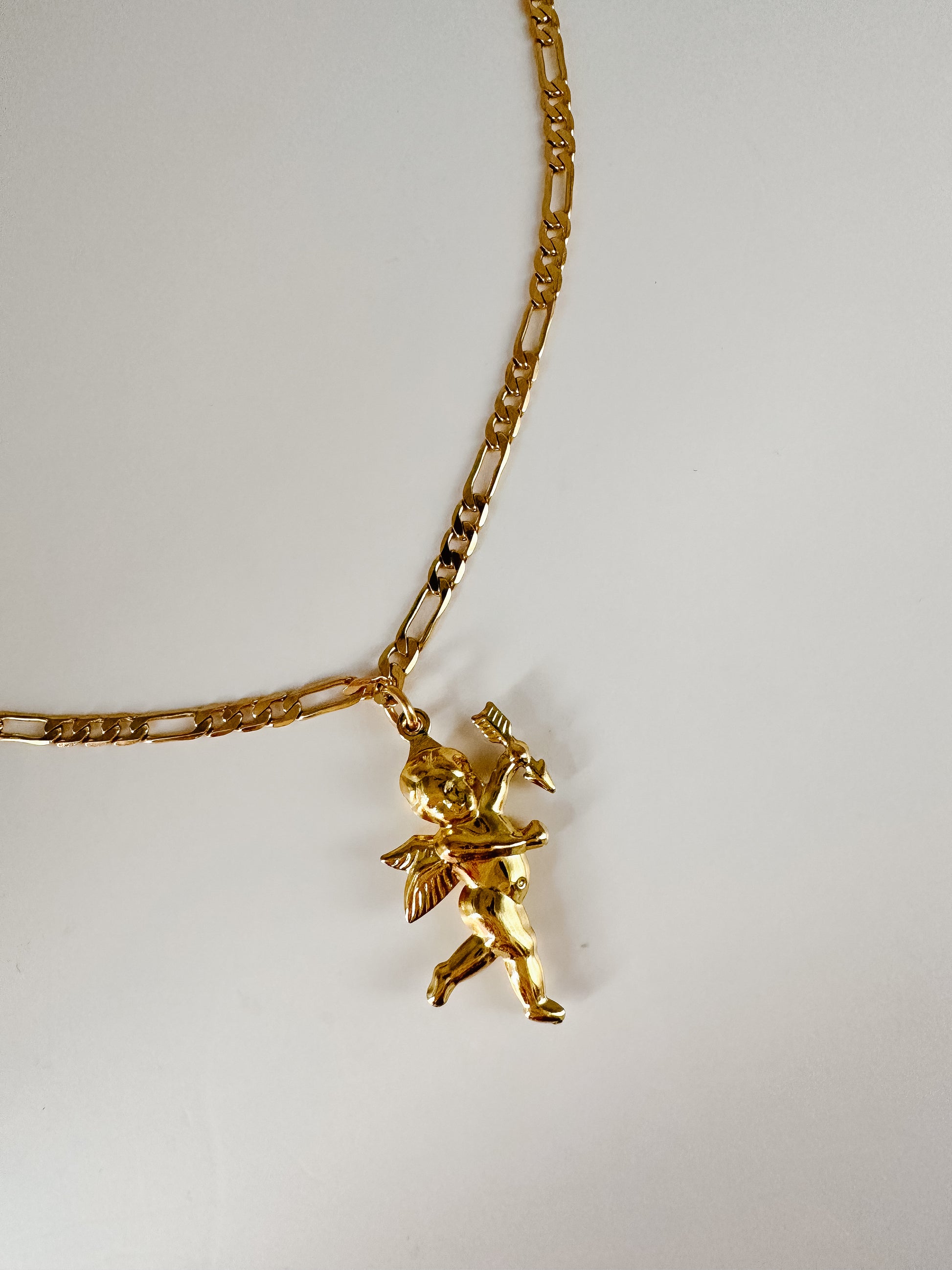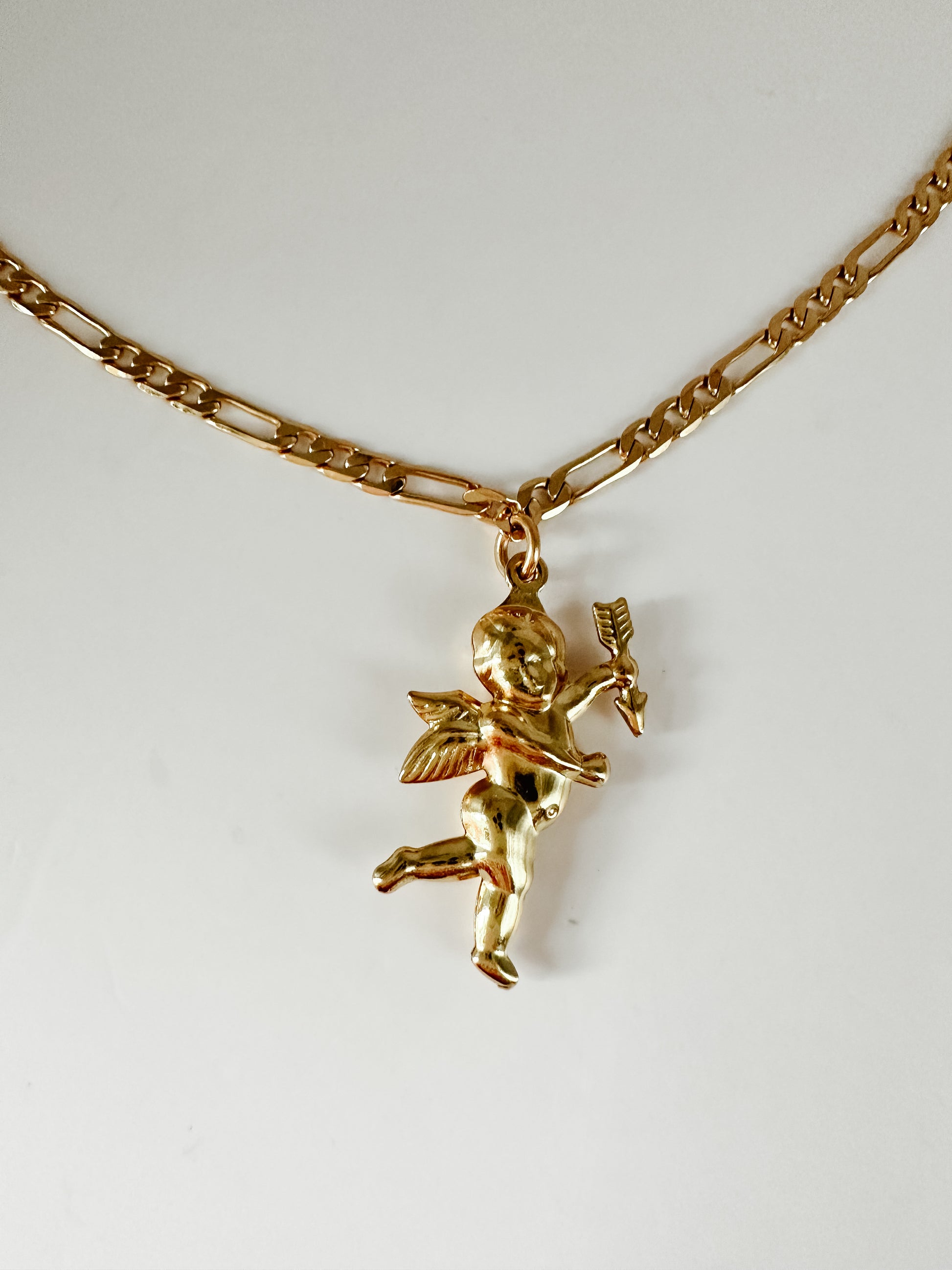 Serving major don’t-mess-with-me vibes with a playful nod to romance. This bold Figaro chain holds a gleaming gold Cupid charm—perfect for the days you’re keeping your heart to yourself.