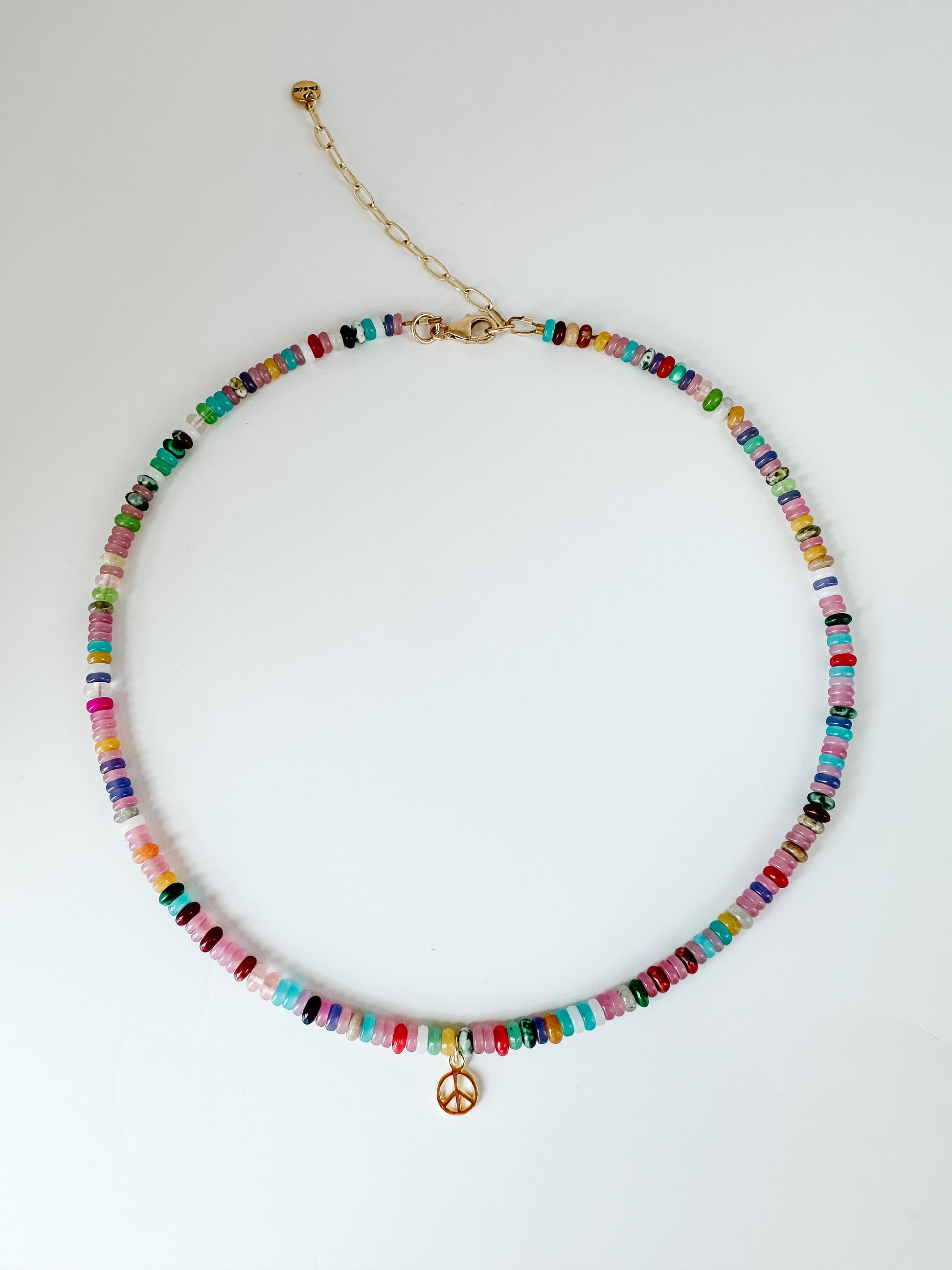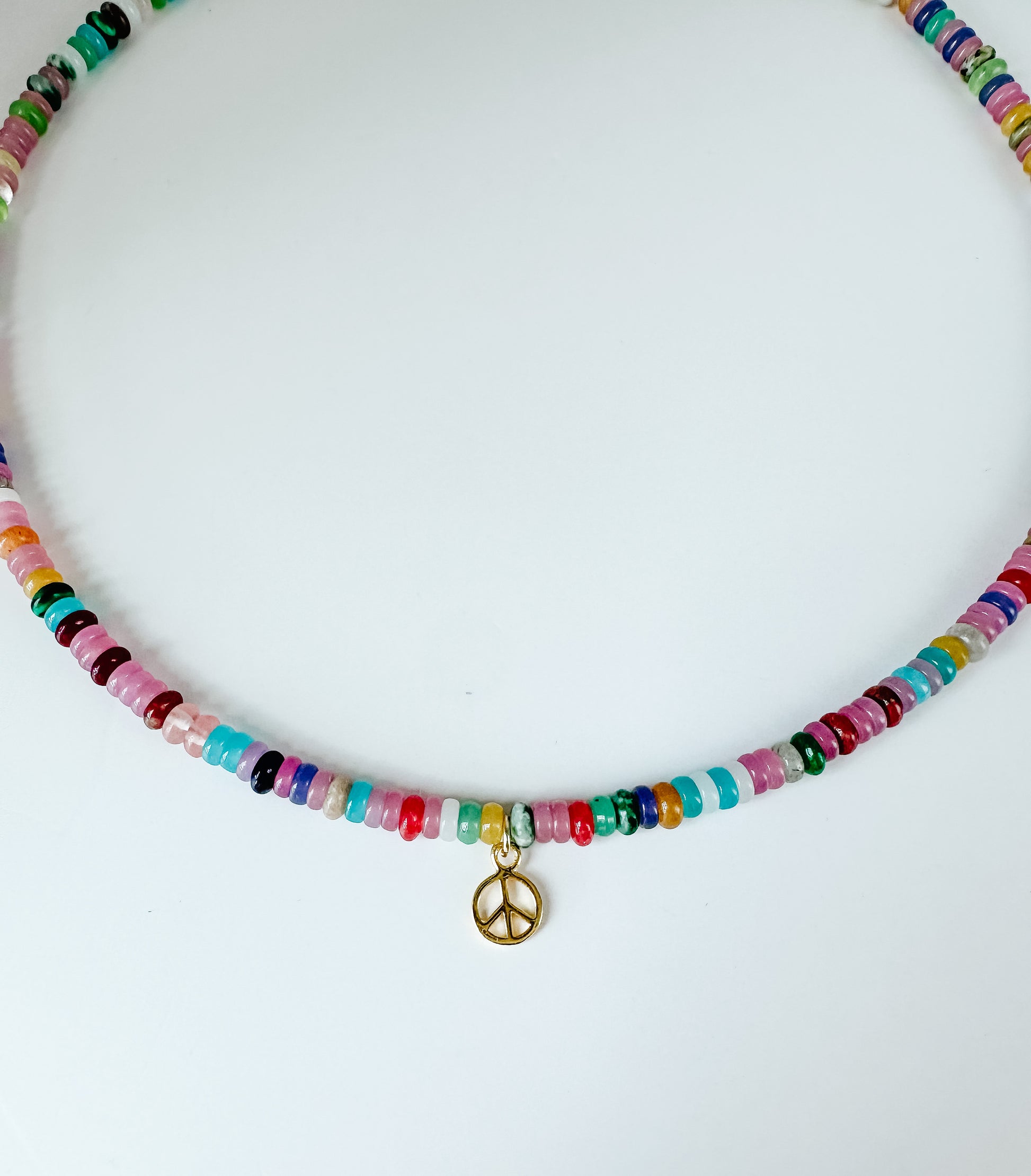 Materials: Slices of gemstones with gold filled peace sign charm. Findings are gold filled. Slices of gemstones are 2 mm x 4mm
