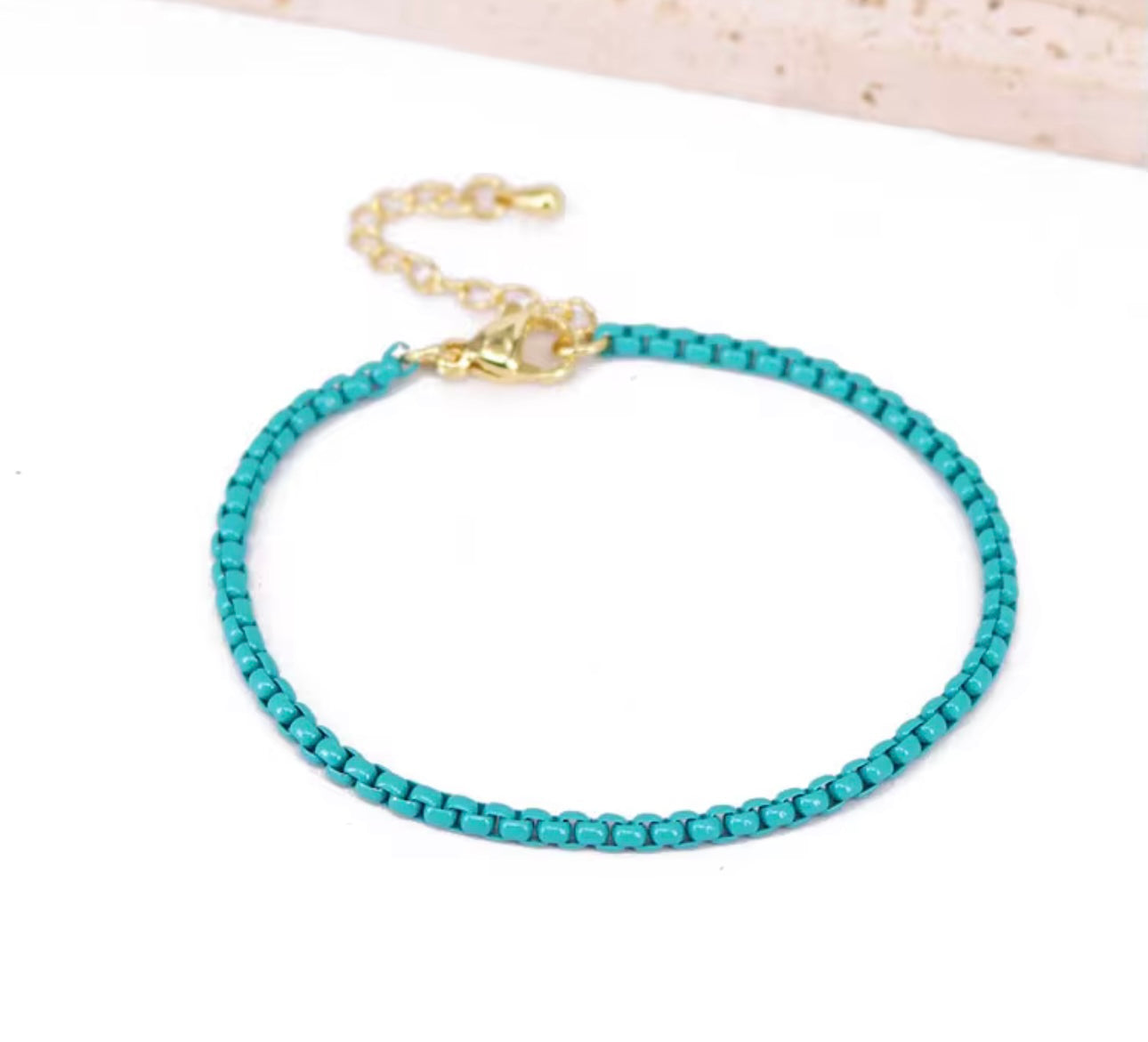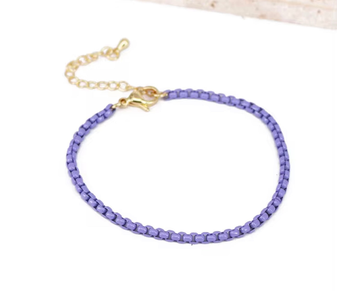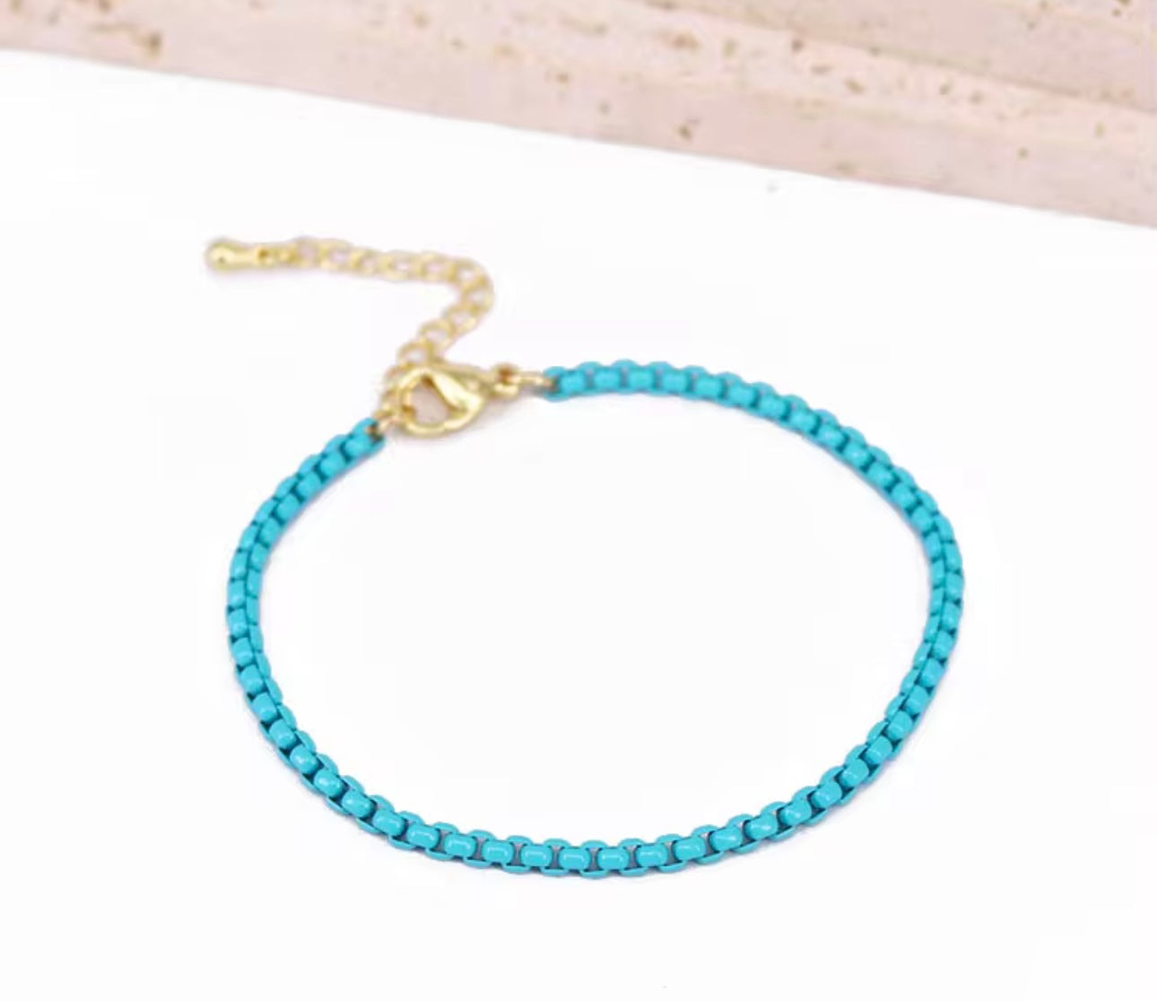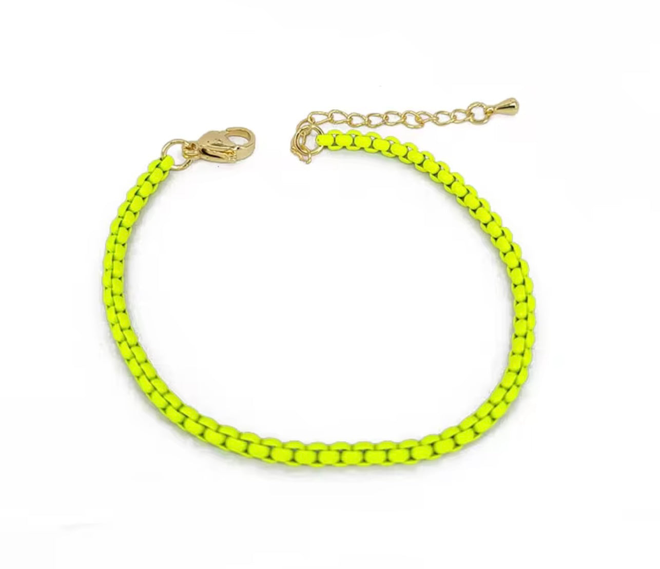 Simple, bold, and full of color—these vibrant box chain bracelets are your new everyday favorite. Each piece features a single pop of enamel-coated color with sleek gold hardware, perfect for stacking or wearing solo. Lightweight, durable, and adjustable for the perfect fit, they’re the easiest way to add some rainbow energy to your look.