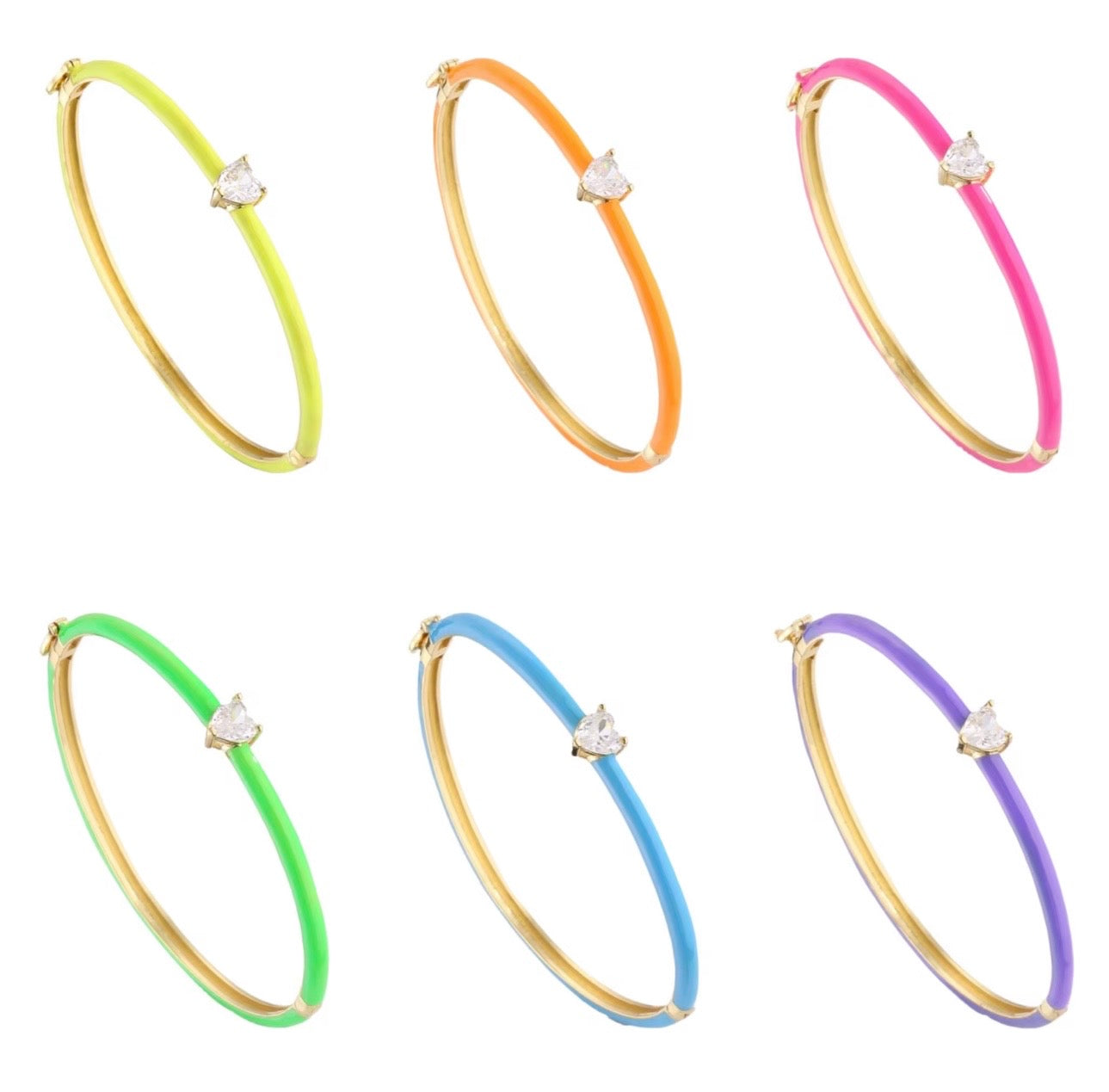 Each glossy enamel cuff features a sparkling heart-cut crystal centerpiece set in 18k gold plating, giving you the perfect mix of playful nostalgia and everyday sparkle. Lightweight, stackable, and designed to fit comfortably up to a 8” wrist, these cuffs are meant to be worn solo or layered in full rainbow sugar-rush style.