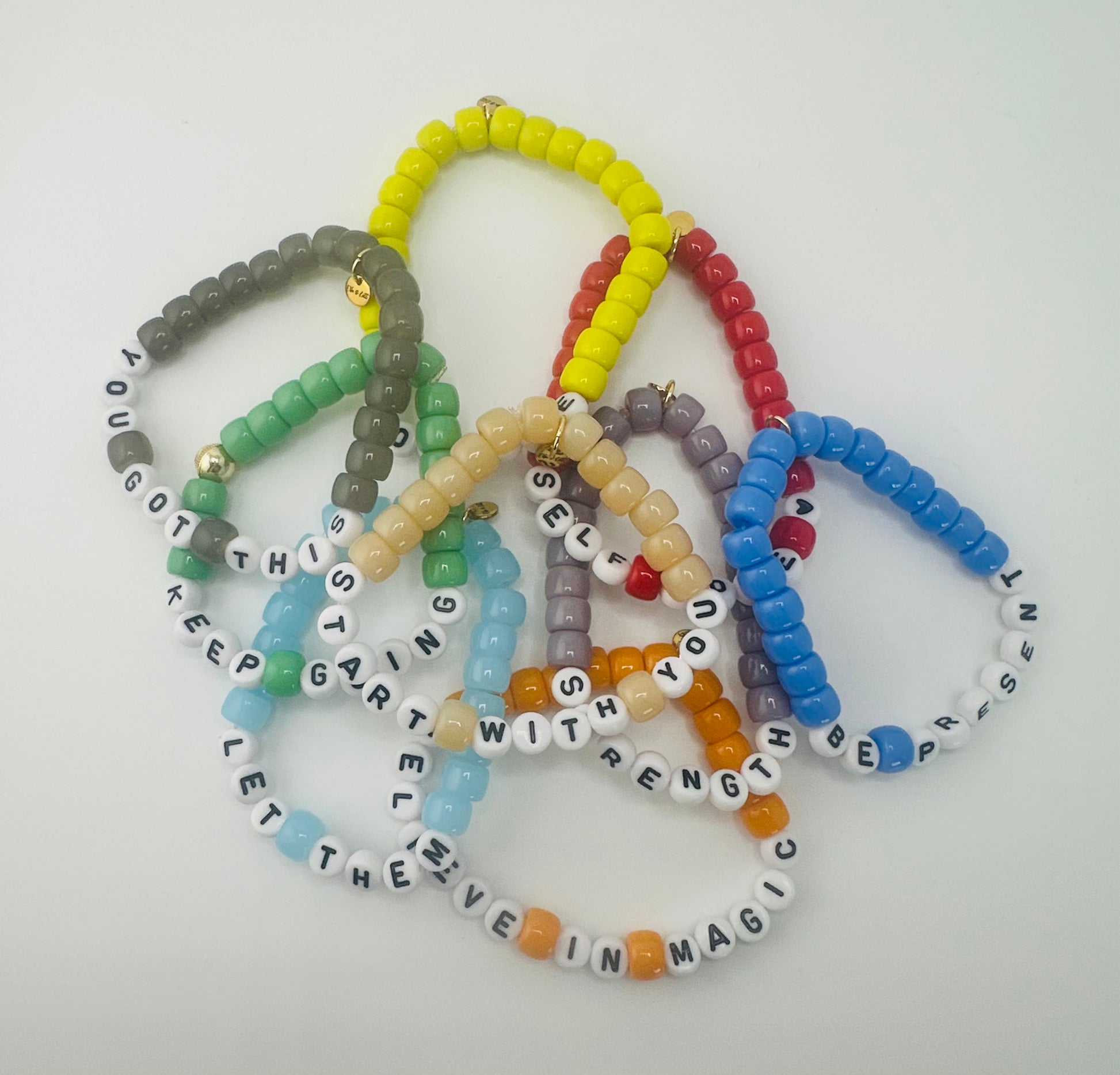 Made with colorful glass beads and stretch cord, each bracelet is lightweight, easy to wear, and full of meaning. Choose the reminder you need most, or stack them together for extra strength.
