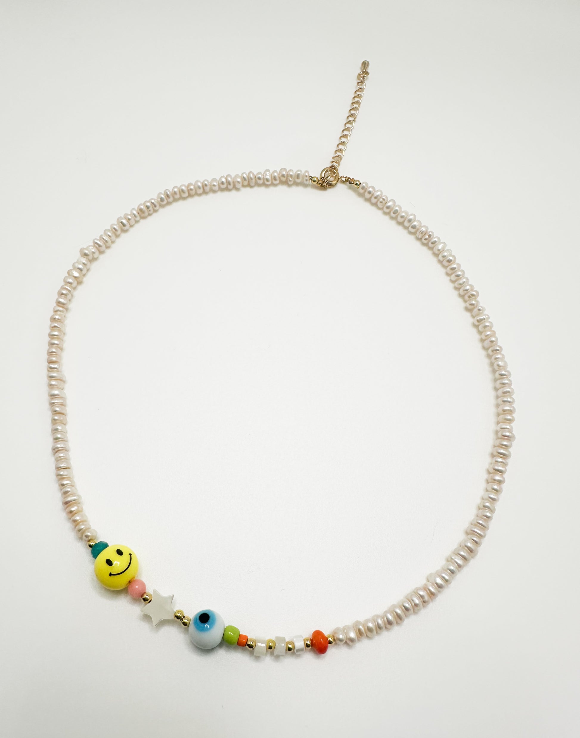 The Smile Baby necklace is a joyful mix of freshwater pearls, seed beads, happy faces, and protective evil eyes — all strung together for the cutest little vibe. Playful, positive, and perfect for layering.